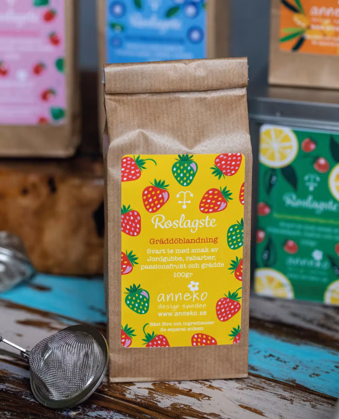 Ett lekfullt och somrigt svart te med smak av jordgubbe, rabarber, passionsfrukt och grädde. Gräddöblandning är en riktig favorit för dig som älskar söta, fruktiga och mjuka smaker.