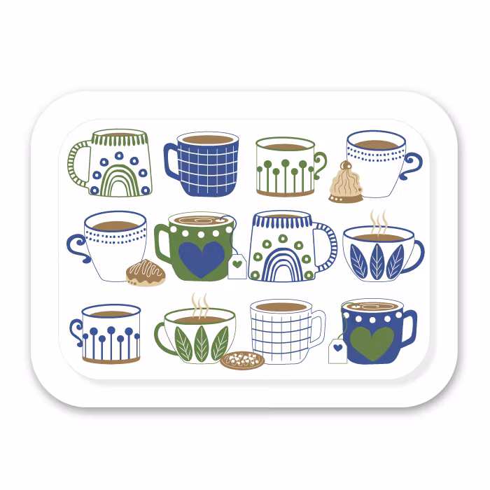 Liten men full av charm – “Blue Fika”, designad av Anneli Asplund, är en svensktillverkad bricka i 27 × 20 cm, perfekt för att servera kaffe, te eller en liten fika med stil. Mönstret är en hyllning till svensk fikatradition, med blå kaffekoppar, temuggar och klassiska godsaker som kokostoppar och biskvier i en härlig blå-grön färgskala.