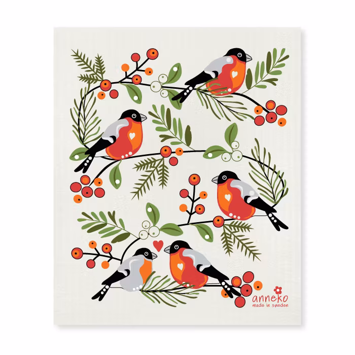 Skapa vinterstämning i köket med disktrasan “Domherren”, designad av Anneli Asplund. Motivet med den klassiska vinterfågeln domherren i röda och grå nyanser ger en varm och traditionell känsla – perfekt för vinterns alla stunder vid köksbordet.