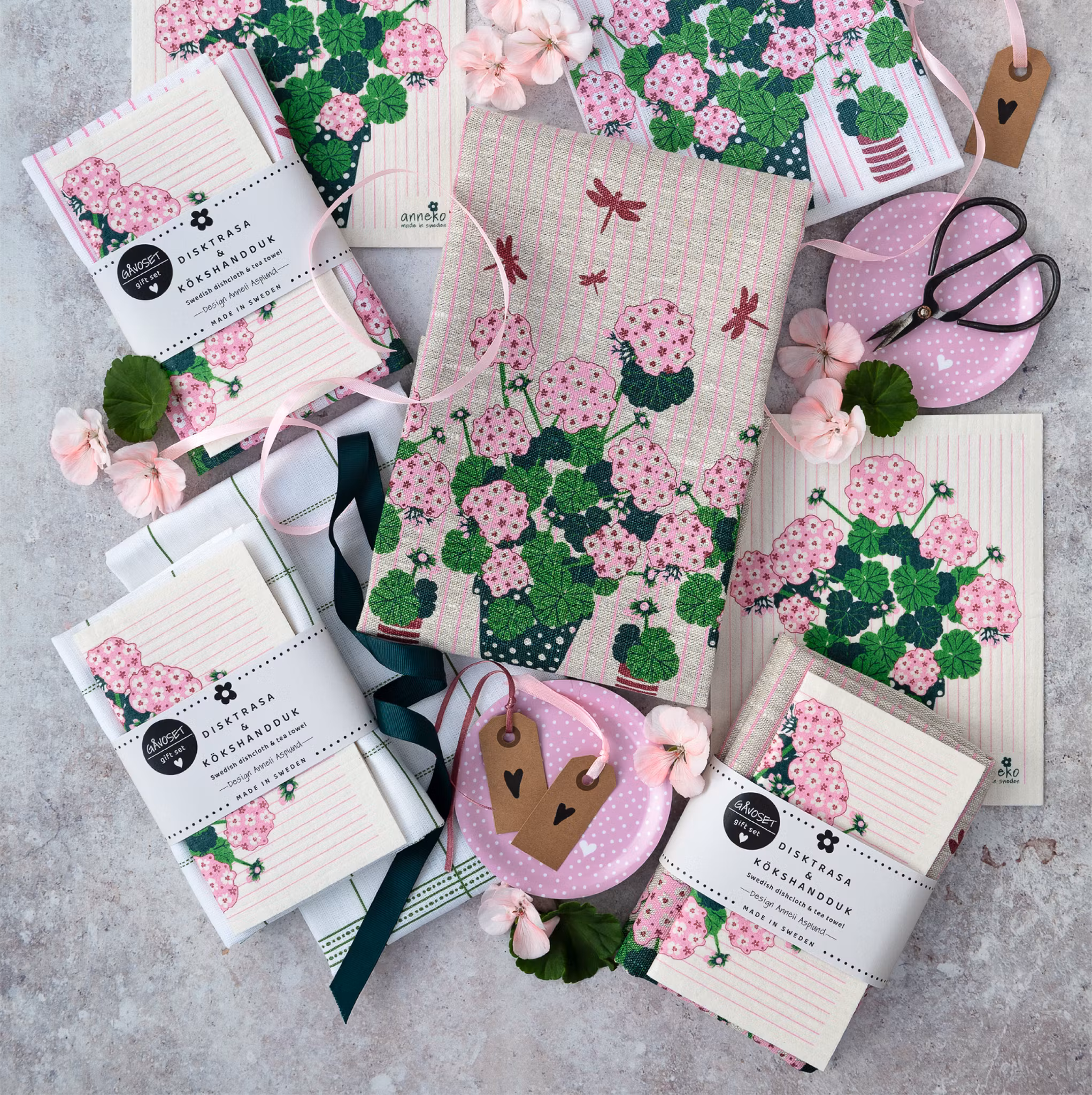 Letar du efter en vacker, användbar och hållbar present? Då är vårt Gåvoset “Pelargon” det perfekta valet! Setet innehåller en miljövänlig disktrasa med det älskade pelargonmönstret “Mammas pelargon”, designad av Anneli Asplund, tillsammans med en exklusiv kökshandduk – där du själv väljer vilken stil som passar bäst.