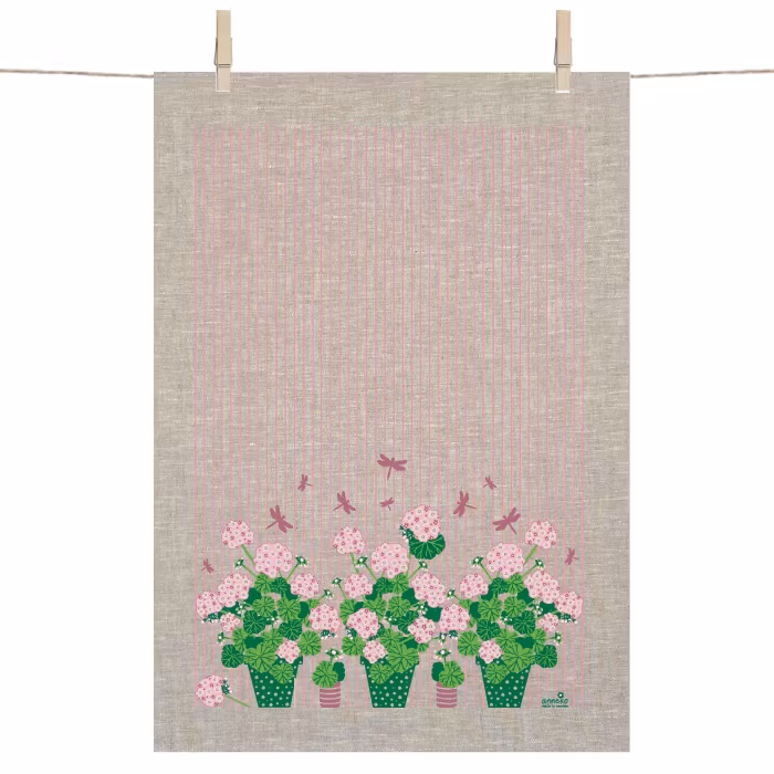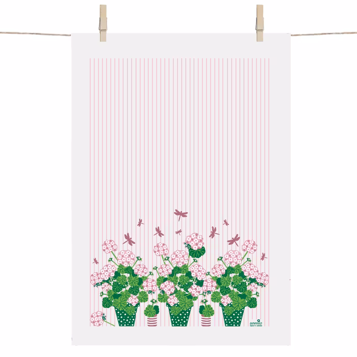 Mönstret med mjukt rosa pelargoner och gröna blad för tankarna till blommande fönsterbrädor, somriga torp och den där varma känslan av hemtrevnad. Vackert förpackat och redo att ges bort – eller behåll det själv som en blommande detalj i ditt kök!