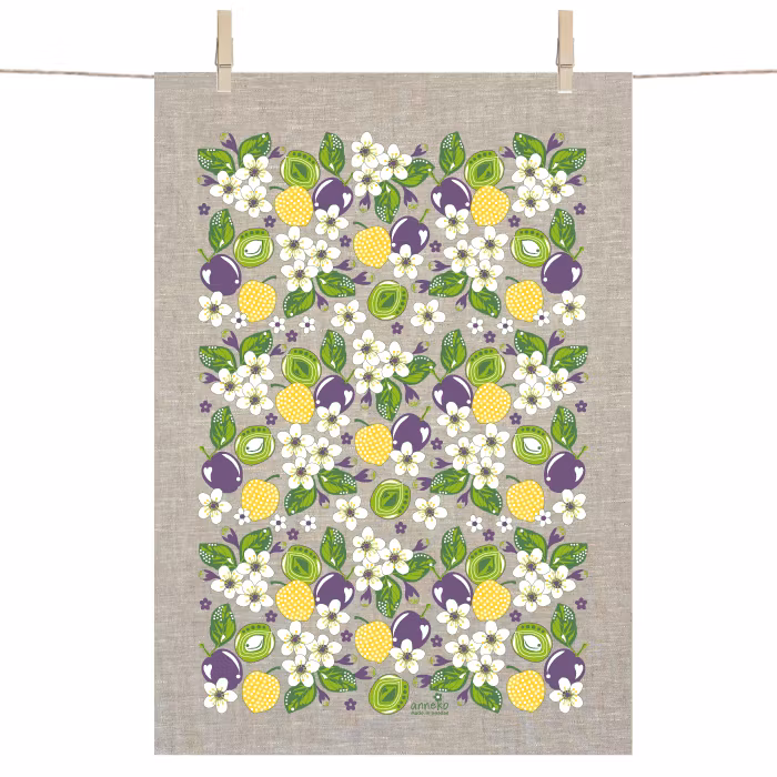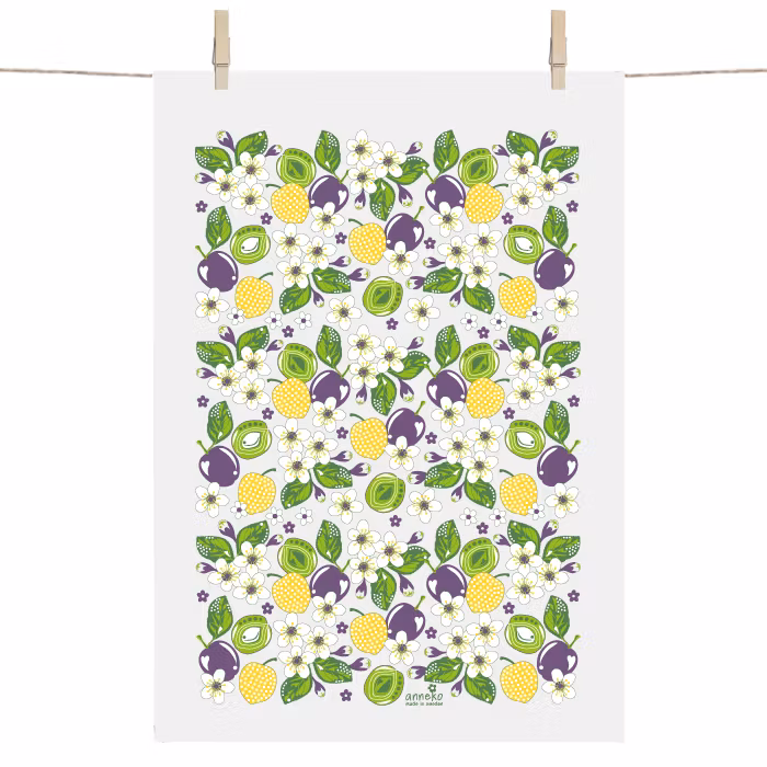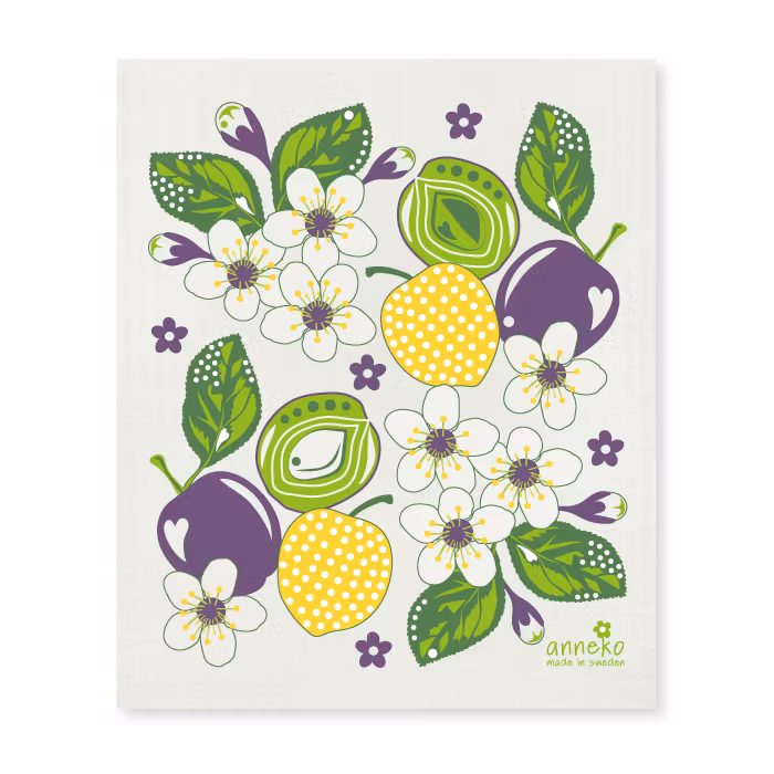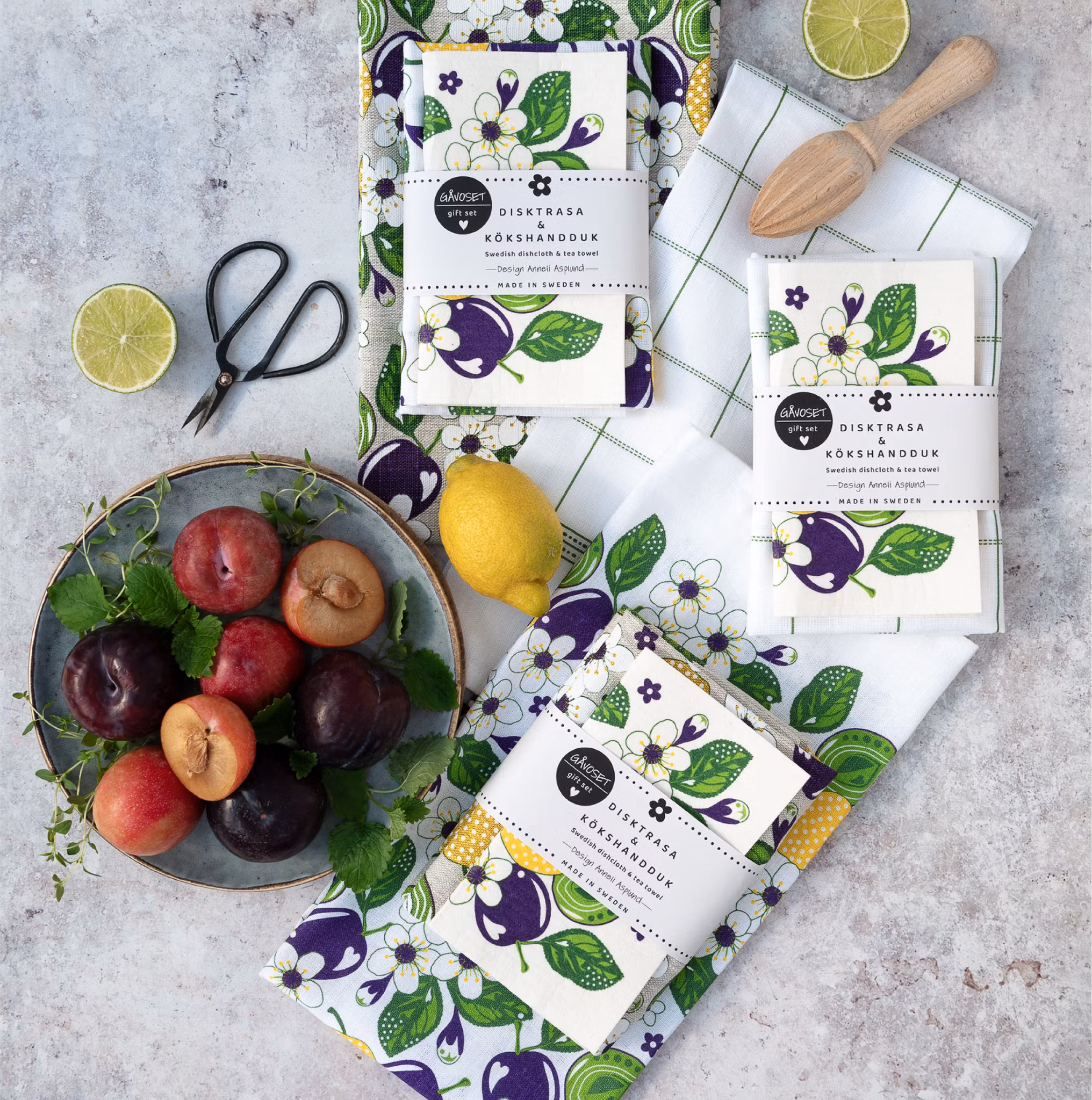 Ge bort en vacker och praktisk gåva med känsla av skörd, sensommar och naturens färger. I vårt Gåvoset “Plommon” får du en miljövänlig disktrasa med det stilfulla plommonmönstret, illustrerat i djupa lila toner och gröna blad – en mättad, varm färgskala som passar perfekt året runt, men kanske allra mest till höst och sensommar.