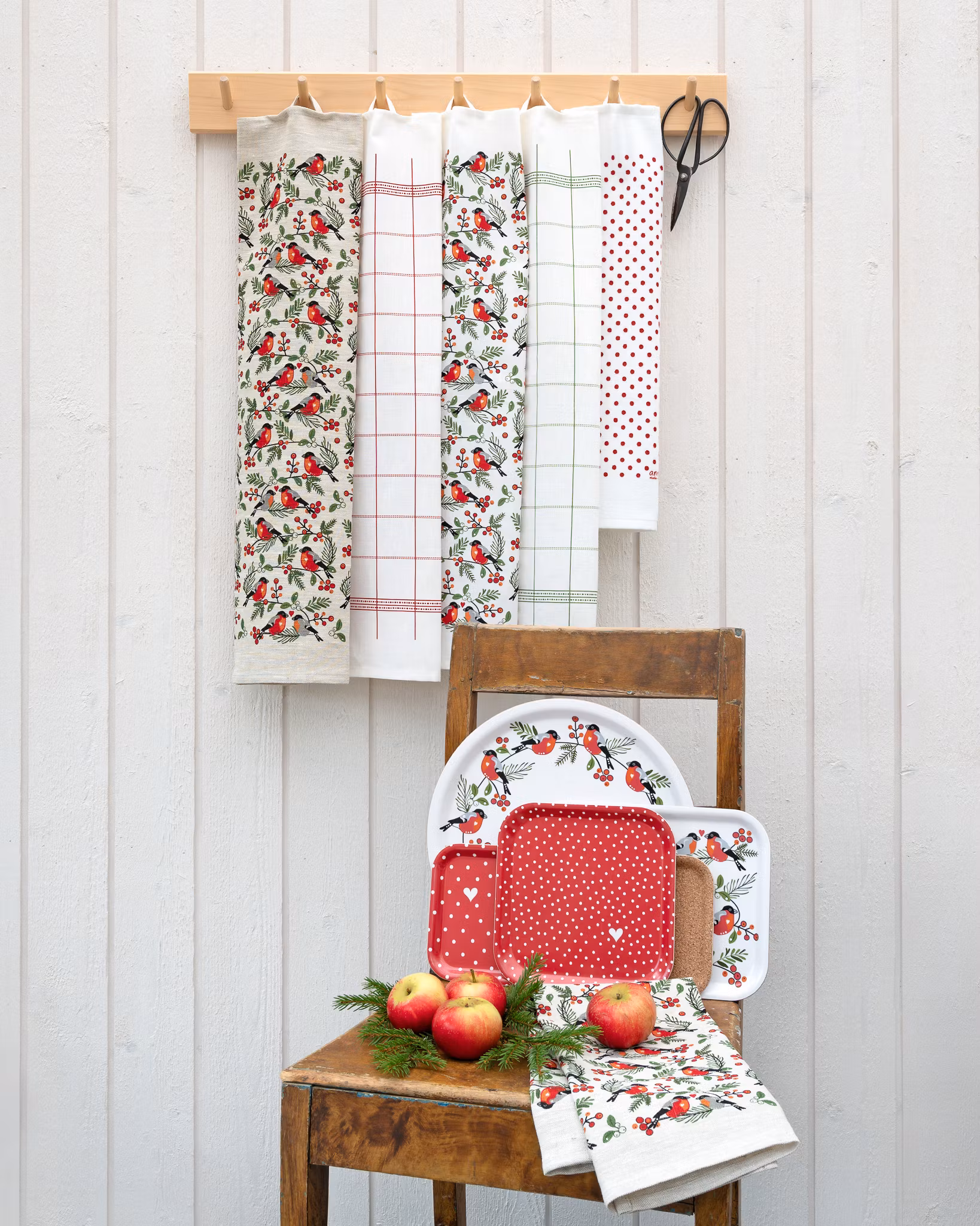 Låt vintern flytta in i köket med kökshandduken “Domherren”, designad av Anneli Asplund. Mönstret med den klassiska domherren i röda och grå nyanser skapar en naturnära och stämningsfull känsla – lika vacker i torpet som i det moderna köket.